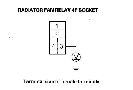 5. Disconnect the jumper wire, and turn the ignition switch ON (II). Check for voltage between radiator fan relay 4P socket terminal No. 3 and body ground.