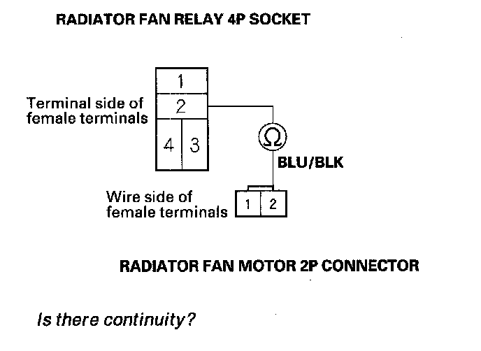 7. Check for continuity between radiator fan relay 4P socket terminal No. 2 and radiator fan motor 2P connector terminal No. 2.