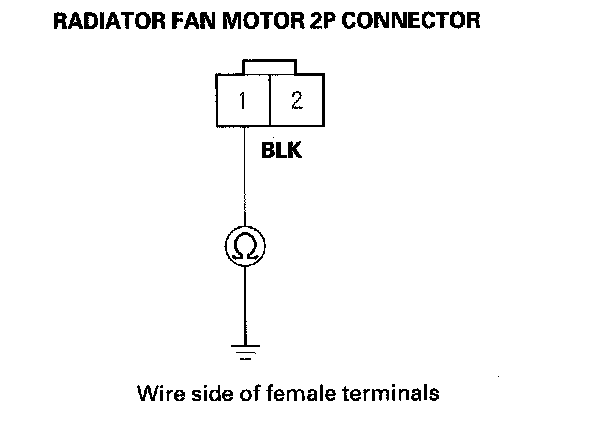 8. Check for continuity between radiator fan motor 2P connector terminal No. 1 and body ground.