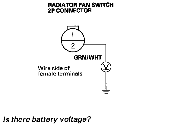 14. Remove the jumper wire, and measure the voltage between radiator fan switch connector terminal No. 2 and body ground.