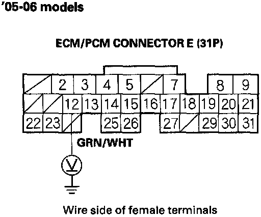9. '02-04 models: Using a backprobe set, measure the voltage between the No.6 terminal of ECM/PCM connector B (24P) and body ground with the ECM/PCM connectors connected. '05-06 models: Using a backprobe set, measure the voltage between the No.12 terminal of ECM/PCM connector E (31 ) and body ground with the ECM/PCM connectors connected.