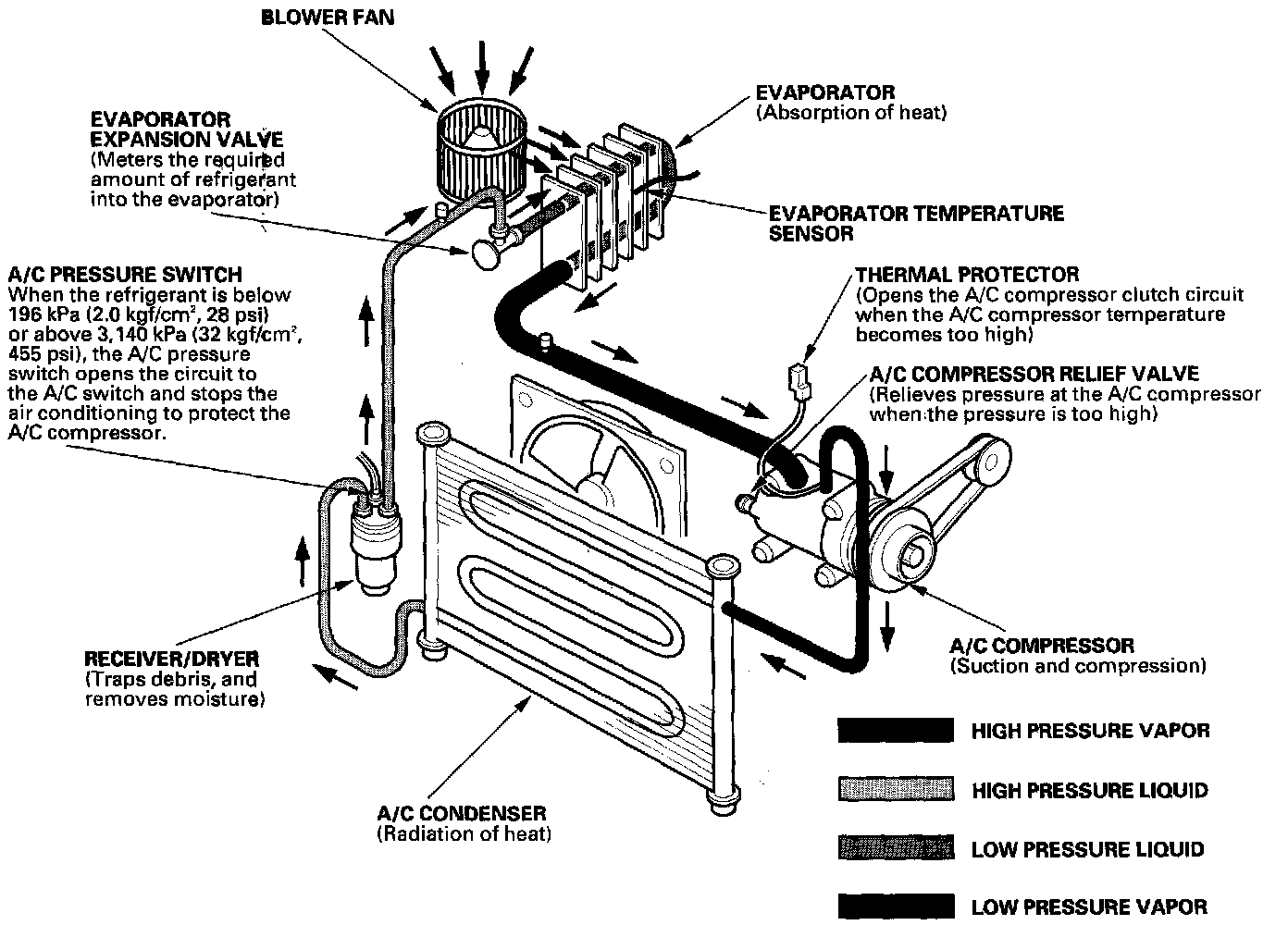 System DescriptionThe air conditioning system removes heat from the passenger compartment by circulating refrigerant through the system as shown above.