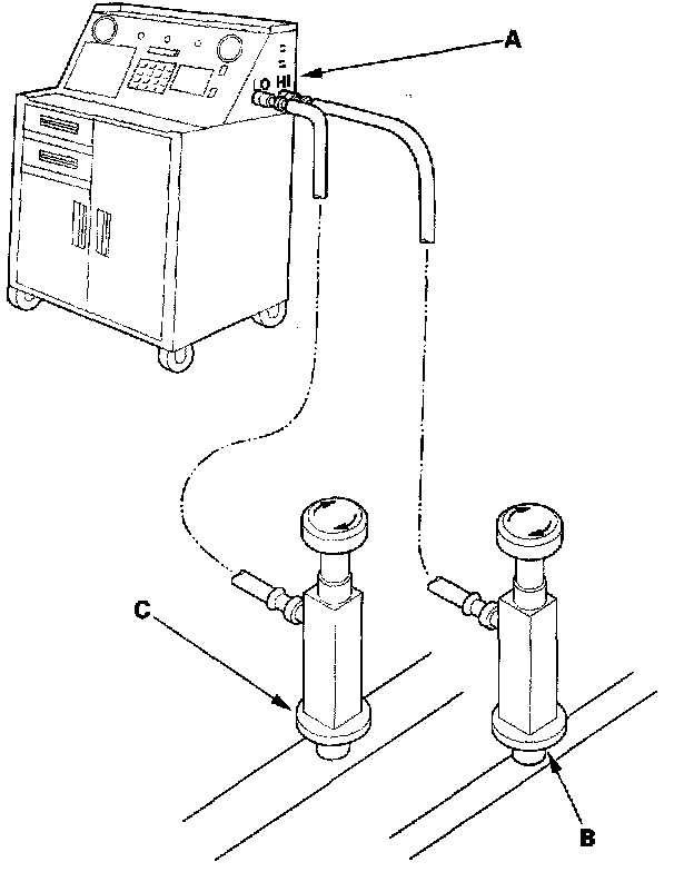 1. Connect an R-134a refrigerant recovery/recycling/ charging station (A) to the high-pressure service port (B) and the low-pressure service port (C), as shown, following the equipment manufacturer's instructions.