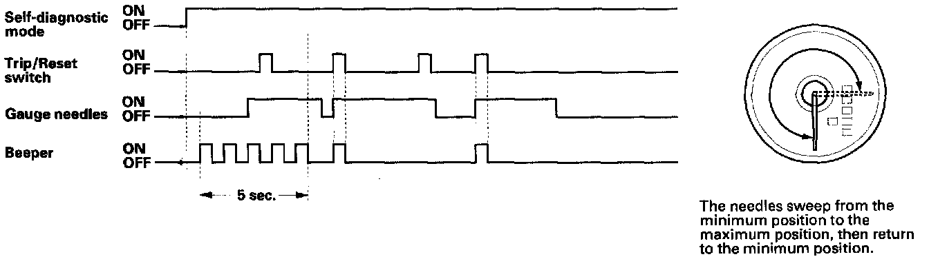 When entering the self-diagnostic mode, the speedometer, the tachometer, the fuel gauge, and the coolant temperature gauge needles move from the minimum position to maximum position, then return to the minimum position.