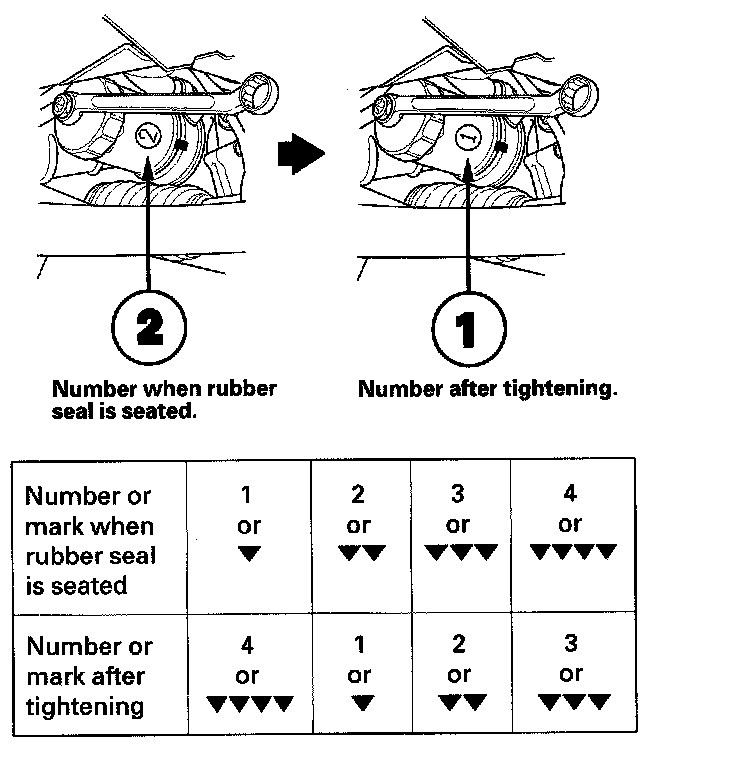 ^ Spin the filter on until its seal lightly seats against the block/oil cooler, and note which number or mark is at the bottom.