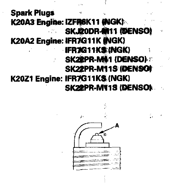 4. Replace the plug at the specified interval, or if the center electrode is founded (A). Use only the spark plugs listed.