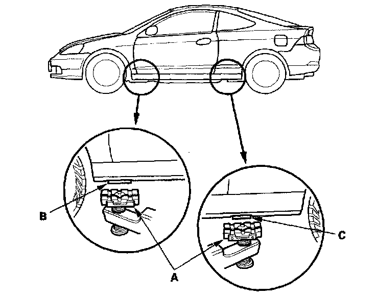 4. Position the floor jack under the front jacking bracket (A) or rear jacking bracket (B), center the jacking bracket in the jack lift platform (C),and jack up the vehicle high enough to fit the safety stands under it.
