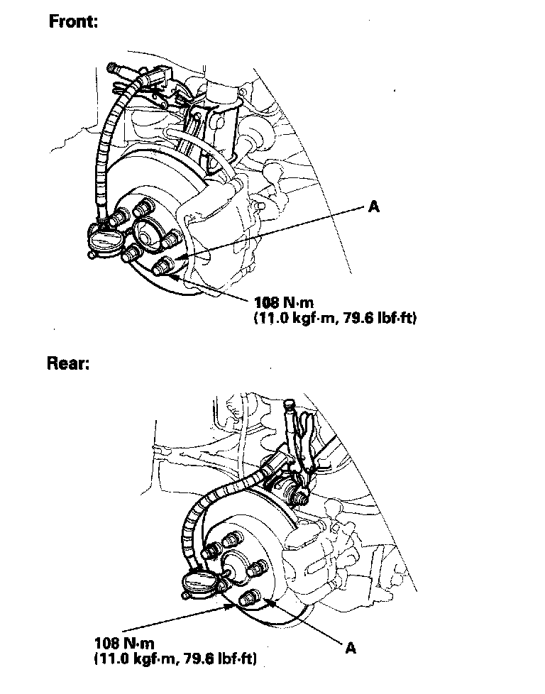 3. Install suitable flat washers (A) and wheel nuts, and tighten the nuts to the specified torque value to hold the brake disc securely against the hub.