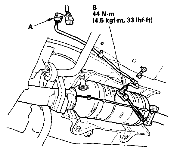 1. Disconnect the secondary HO2S 4P connector (A), then remove the secondary HO2S (B).