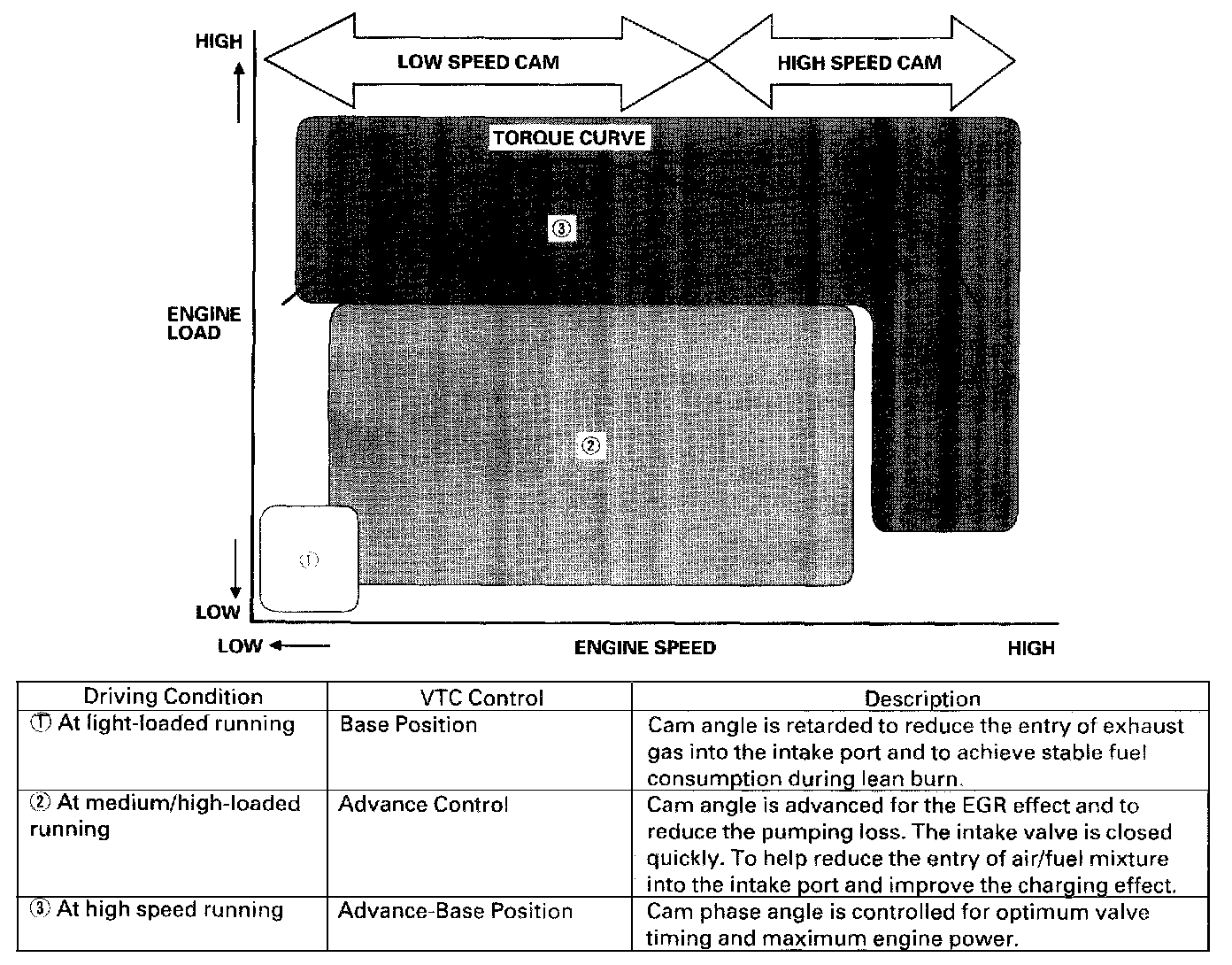 - Cam angle is advanced to obtain the EGR effect and reduce the pumping loss. The intake valve is closed quickly to reduce the entry of the air/fuel mixture into the intake port and improve the charging effect.