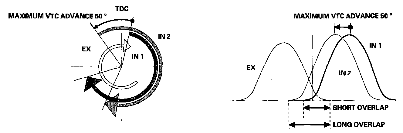 - Reduces the cam advance at idle, stabilizes combustion, and reduces engine speed. If a malfunction occurs, VTC system control is disabled and the valve timing is fixed at the fully retarded position.