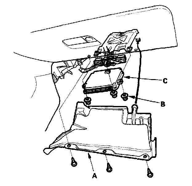 3. Remove the ECM/PCM mounting bolts (B) and the ECM/PCM (C).