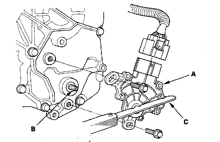 7. Align the cutout (A) on the rotary-frame with the neutral positioning cutouts (B) on the transmission range switch (C), then put a 2.0 mm (0.08 inch) feeler gauge blade (D) in the cutouts to hold it in the N position.