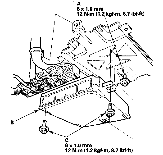 4. Loosen the bolt (A) on the back of the PCM (B), and remove the two bolts (C) and PCM.