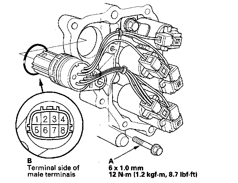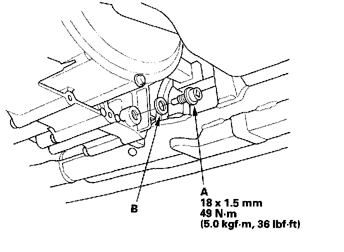 11. Remove the bolt (A), and remove the shift solenoid harness connector (B).
