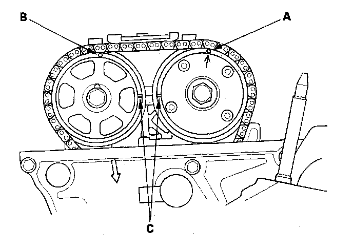 2. Set the No. 1 piston at TDC. The punch mark (A) marked with an arrow on the variable valve timing control (VTC) actuator and the punch mark (B) on the exhaust camshaft sprocket should be at the top. Align the TDC marks (C) on the VTC actuator and exhaust camshaft sprocket,
