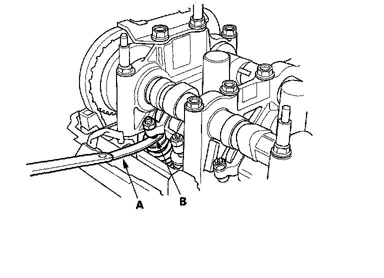 4. Insert the feeler gauge (A) between the adjusting screw (B) and the end of the valve stem, and slide it back and forth; you should feel a slight amount of drag.