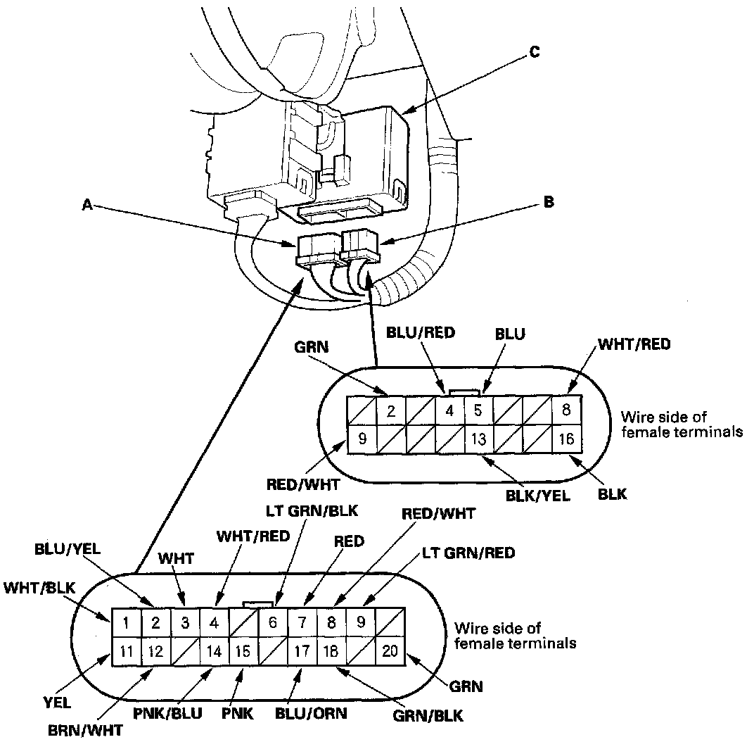 2. Disconnect the 20P connector (A) and 16P connector (B) from the control unit(C).