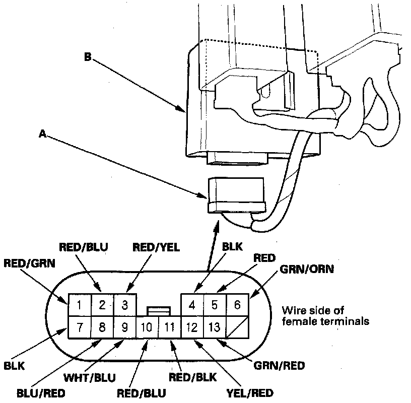 2. Disconnect the 14P connector (A) from the daytime running lights control unit (B).