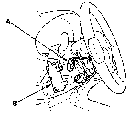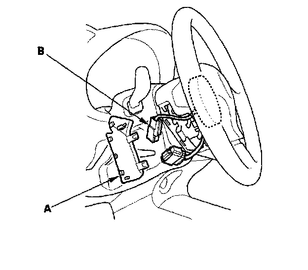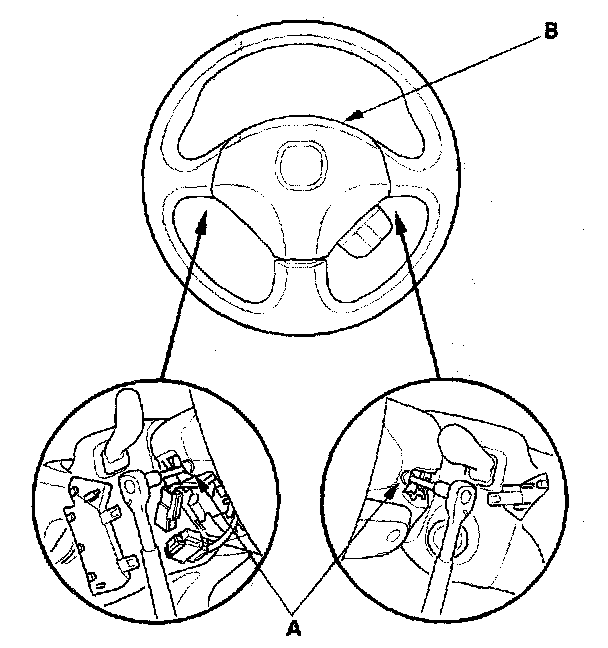 2. Remove the access panel (A) from the steering wheel, then disconnect the driver's airbag 4P connector (B) from the cable reel.