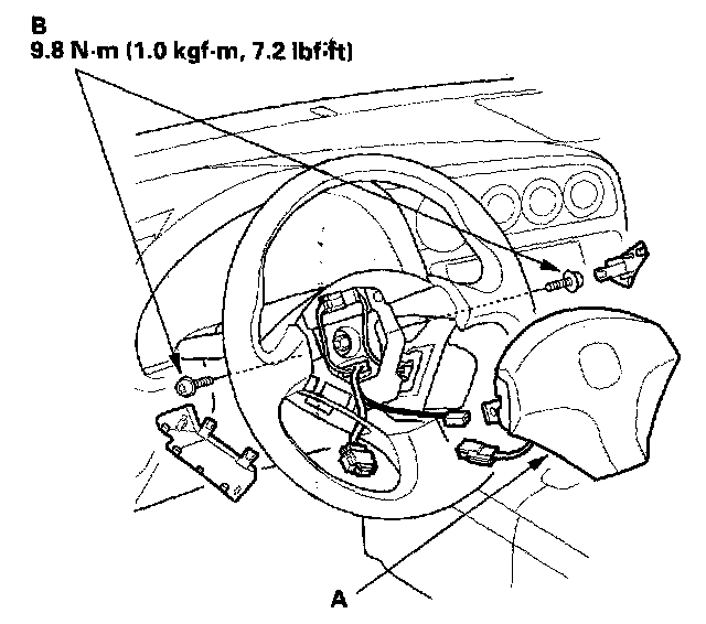 1. Place the new driver's airbag (A) in the steering wheel, and secure it with new Torx bolts (B).