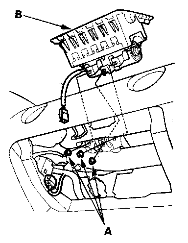 4. Remove the three mounting nuts (A) from the bracket. Cover the lid and dashboard with a cloth, and pry carefully with a screwdriver to lift the front passenger's airbag (B) out of the dashboard.