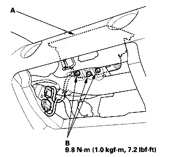 1. Place the new front passenger's airbag (A) into the dashboard. Tighten the front passenger's airbag mounting nuts (B).