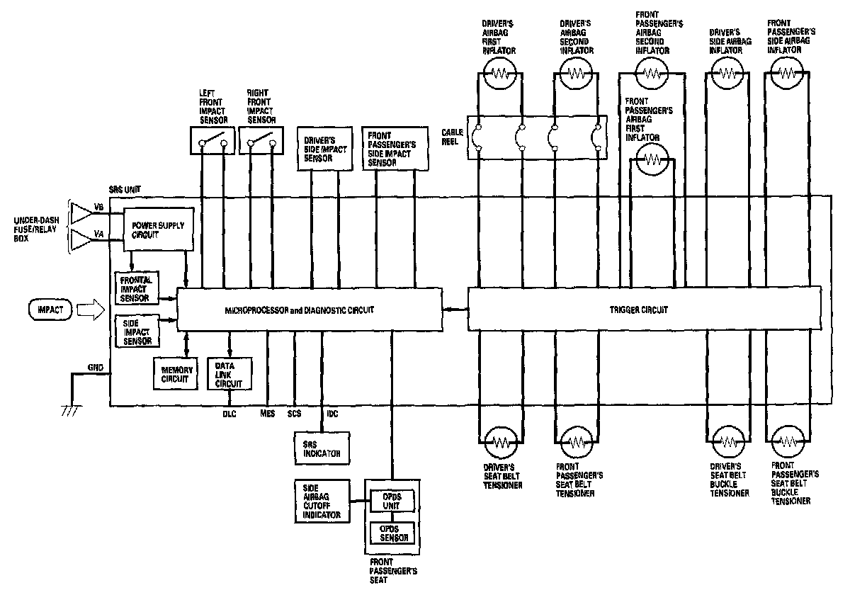 The main circuit in the SRS unit senses and judges the force of impact and, if necessary, ignites the inflator charges. If battery voltage is too low or power is disconnected due to the impact, the voltage regulator and the back-up power circuit, respectively, will keep voltage at a constant level.