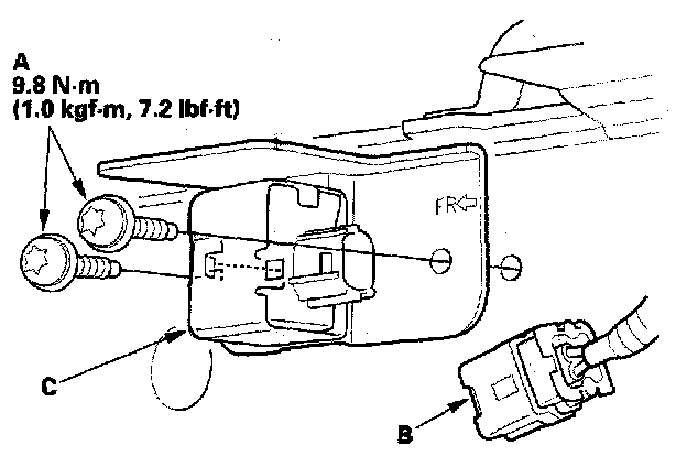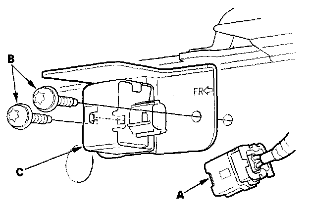 1. Install the new front impact sensor with new Torx bolts (A), then connect the engine compartment wire harness 2P connector (B) to the front impact sensor(C).