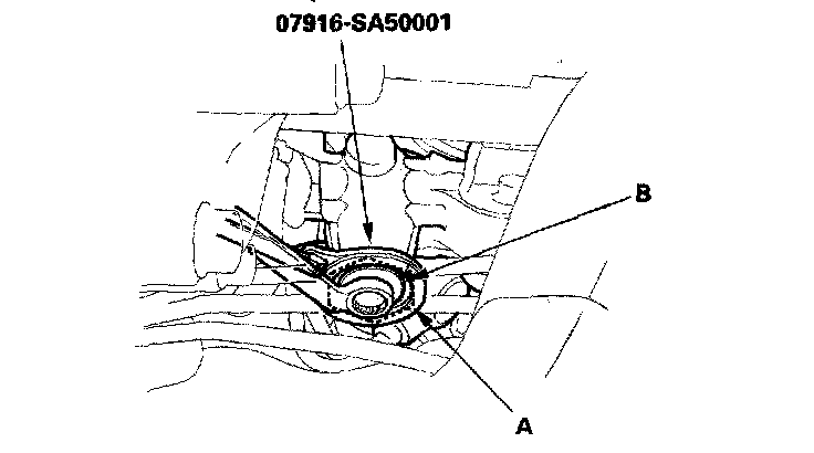 6. Loosen the rack guide screw locknut (A) with the special tool, then remove the rack guide screw (B).