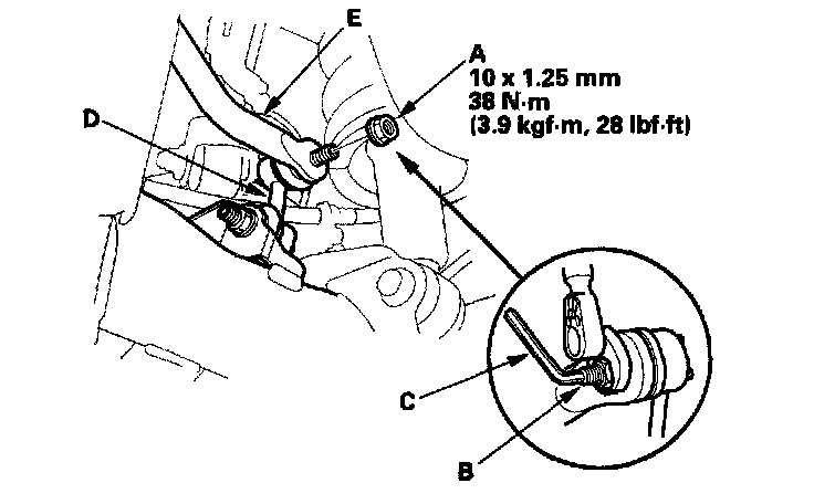 3. Remove the self-locking nuts (A) while holding the joint pins (B) with a hex wrench (C), and disconnect the stabilizer links (D) from the stabilizer bar (E) on the right and left.