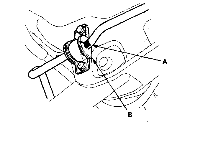 ^ Align the ends of the paint marks (A) on the stabilizer bar with the bushings (B).