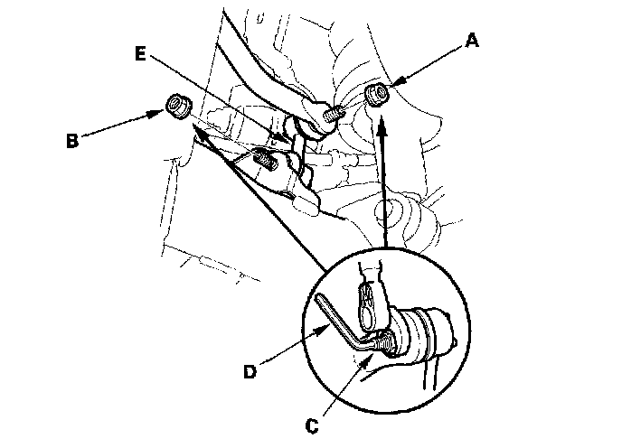 3. Remove the self-locking nut (A) and flange nut (B) while holding the respective joint pin (C) with a hex wrench (D), then remove the stabilizer link (E).