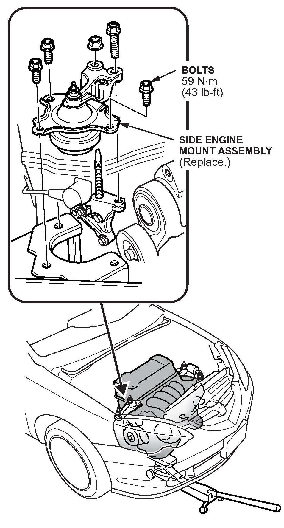 8. While supporting the engine with a jack (making sure the engine is up against the mount), replace the side engine mount and its three mounting bolts.