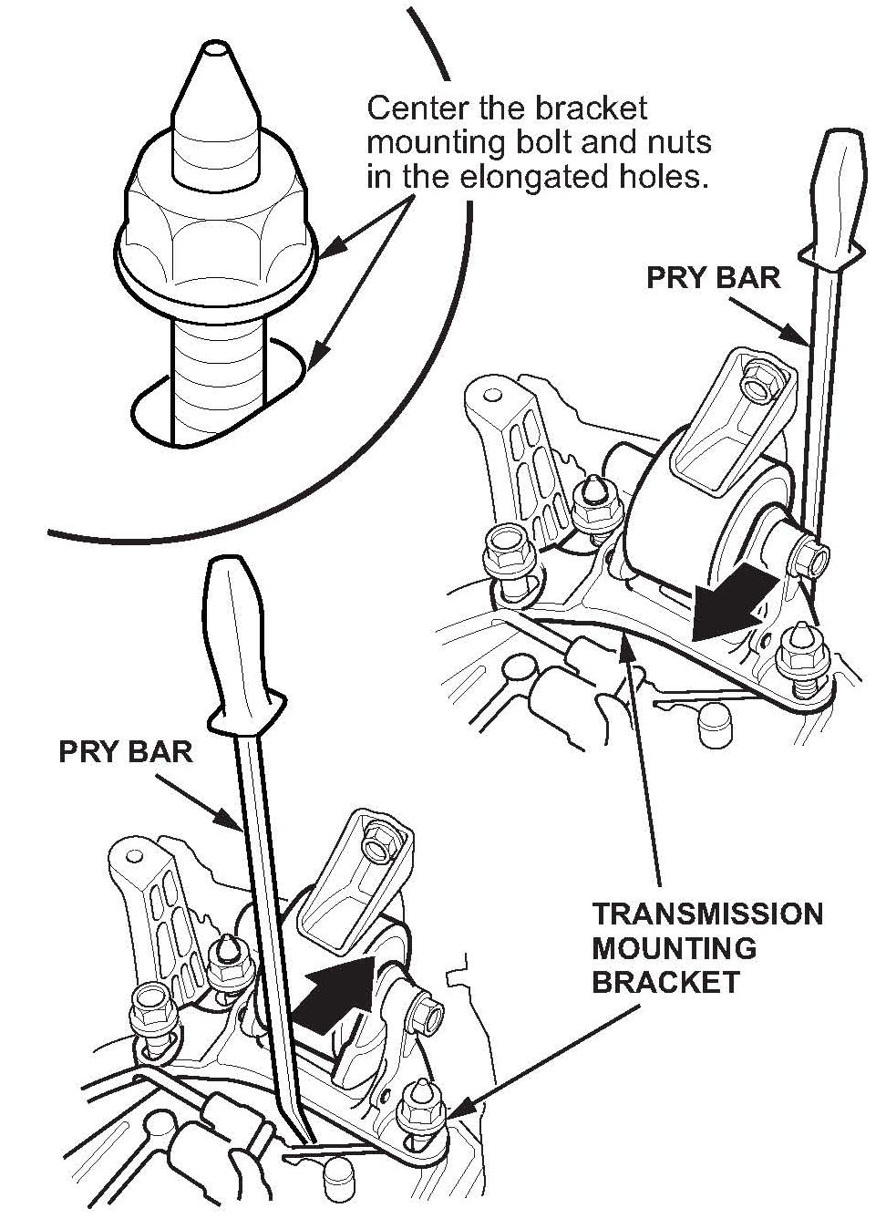 10. With the jack still under the engine, place a pry bar against the transmission mounting bracket, and move the bracket in the direction of the arrow until the oversized hole is covered by the centered bolt and nut, then torque the bolt to 54 N.m (40 lb-ft).