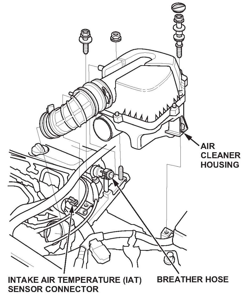 2. Disconnect the intake air temperature (IAT) sensor connector, remove the breather hose, then remove the air cleaner housing.