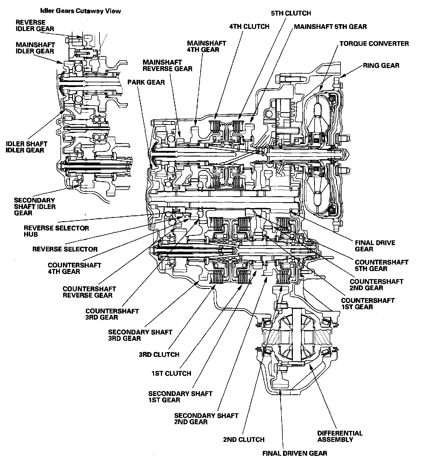 The idler gear on the idler shaft transmits power between the mainshaft and the secondary shaft. The reverse idler gear transmits power from the mainshaft reverse gear to the countershaft reverse gear, and changes rotational direction of the countershaft to reverse.