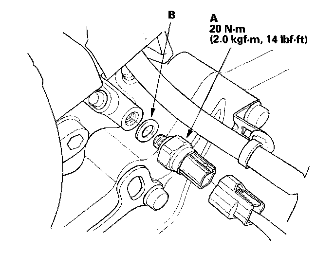 3. Remove the 2nd clutch transmission fluid pressure switch, then install a new one with a new sealing washer (B). Tighten the switch to the specified torque.