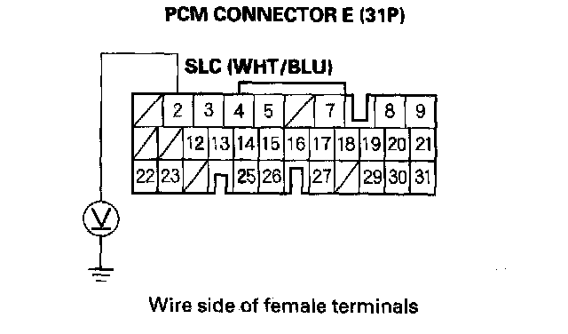 3. Press the brake pedal, release the accelerator pedal, and measure the voltage between PCM connector terminal E2 and body ground.