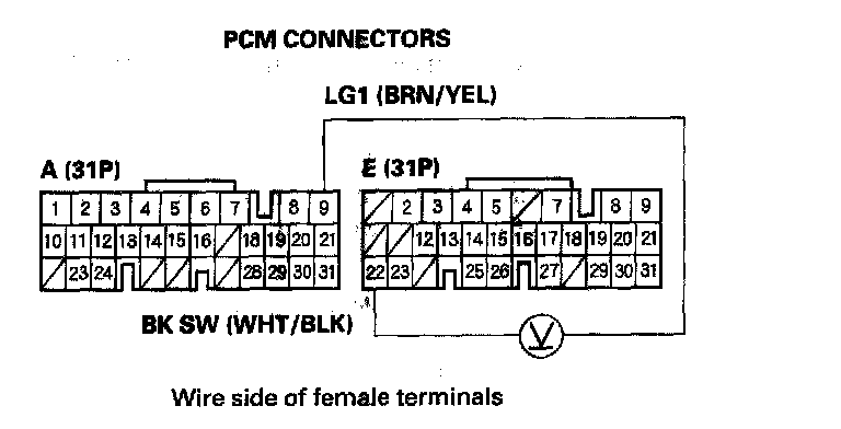 11. Press the brake pedal, and measure the voltage between PCM connector terminal E22 and A9.