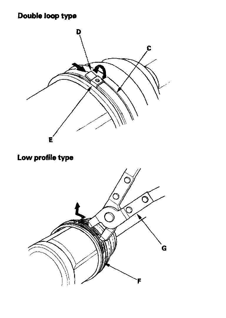 - If the boot band is a low profile type (F), pinch the boot band using commercially available boot band pincers (G).