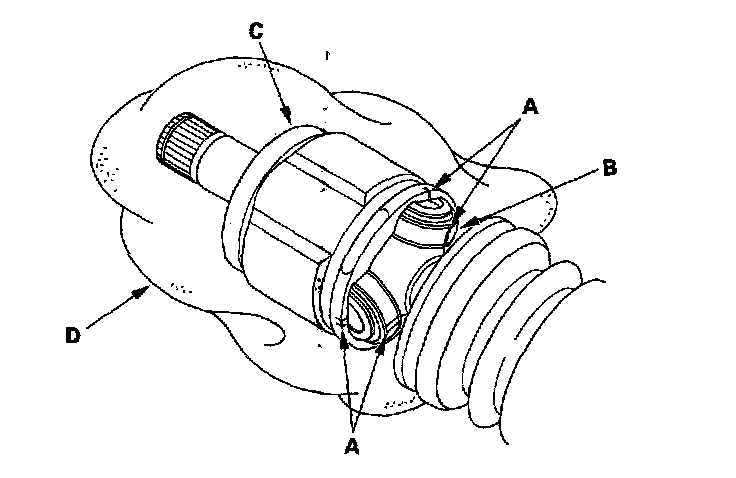 3. Make a mark (A) on each roller (B) and inboard joint (C) to identify the locations of rollers and grooves in the inboard joint. Then remove the inboard joint on the shop towel (D). Be careful not to drop the rollers when separating them from the inboard joint.