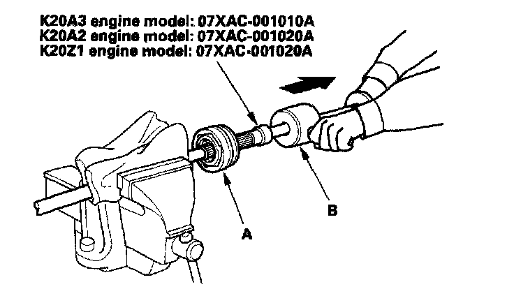 6. Remove the outboard joint (A) using the special tool and a commercially available 5/8"-18 UNF slide hammer (B).