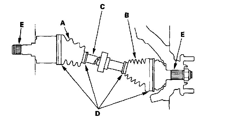 Driveshaft Inspection1. Check the inboard boot (A) and the outboard boot (B) on the driveshaft (C) for cracks, damage, leaking grease, and loose boot bands (D). If any damage is found, replace the boot and boot bands.