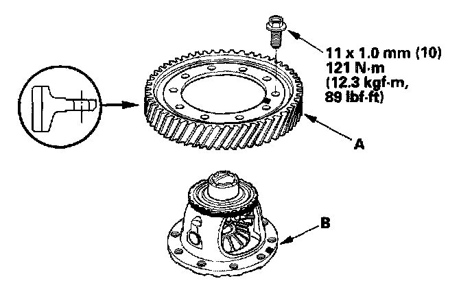 Differential Carrier, Final Driven Gear Replacement1. Remove the bolts (left-hand threads) in a crisscross pattern in several steps, then remove the final driven gear (A) from the differential carrier (B).