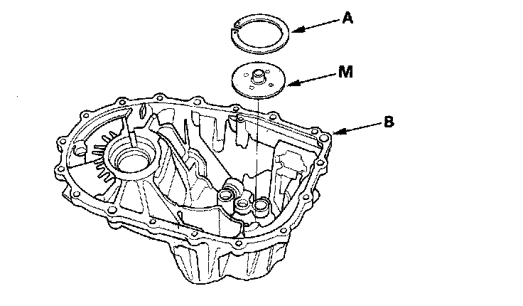 1. Remove the 72 mm shim (A) and oil guide plate M from the transmission housing (B).