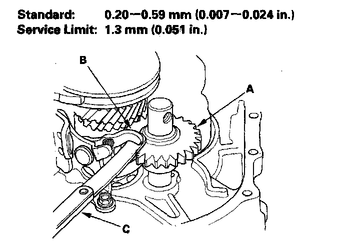 Reverse Shift Fork Clearance Inspection1. Measure the clearance between the reverse idler gear (A) and the reverse shift fork (B) with a feeler gauge (C). If the clearance is more than the service limit, go to step 2.