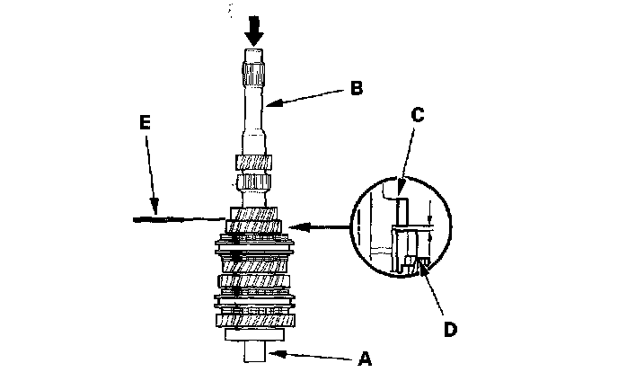 2. Measure the clearance between 2nd (C) and 3rd (D) gears with a feeler gauge (E).