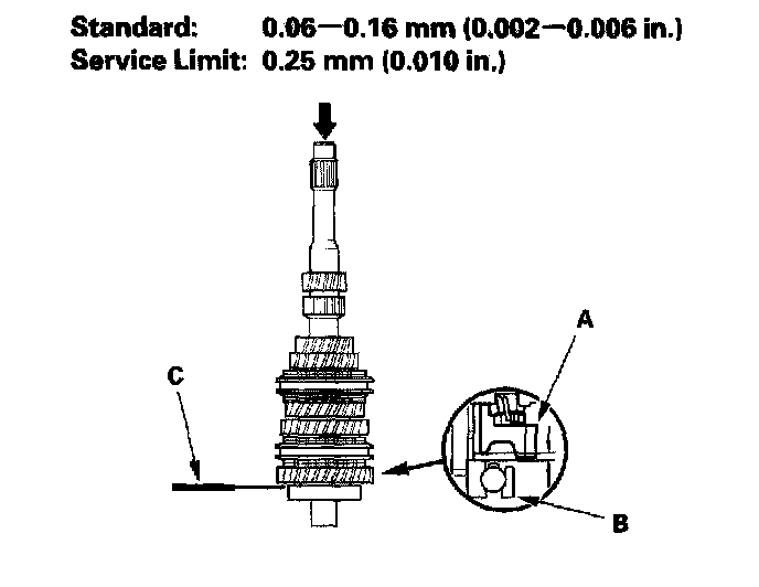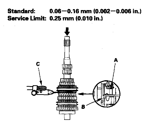 11. 6-speed model: Measure the clearance between 6th gear (A) and the angular ball bearing (B) with a feeler gauge (C). If the clearance is more than the service limit, go to step 12.