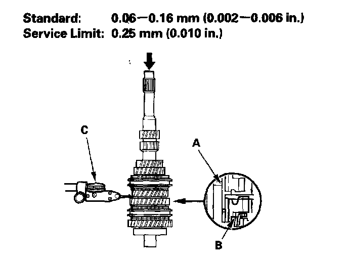 4. Measure the clearance between 4th gear (A) and the distance collar (B) with a dial indicator (C). If the clearance is more than the service limit, go to step 5.